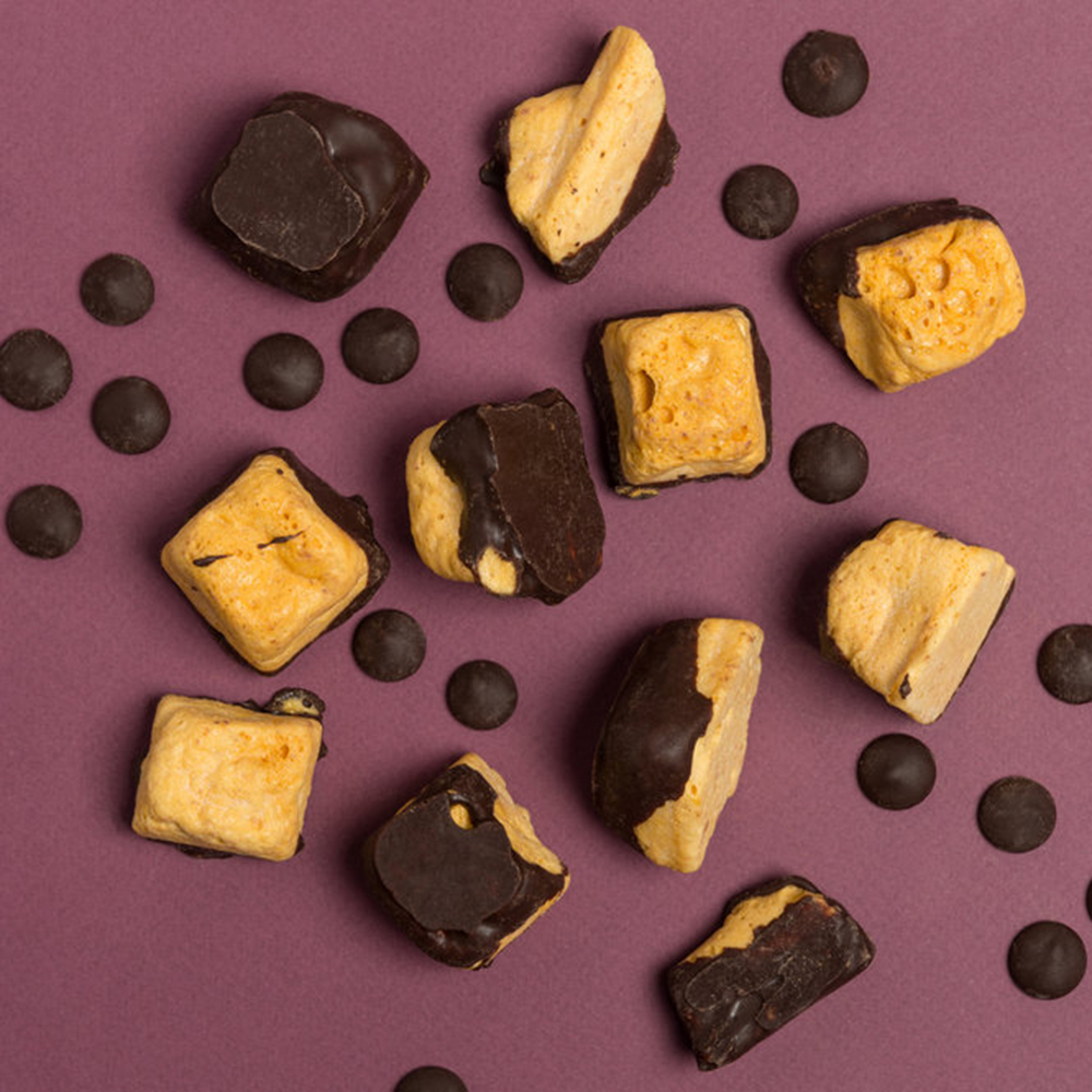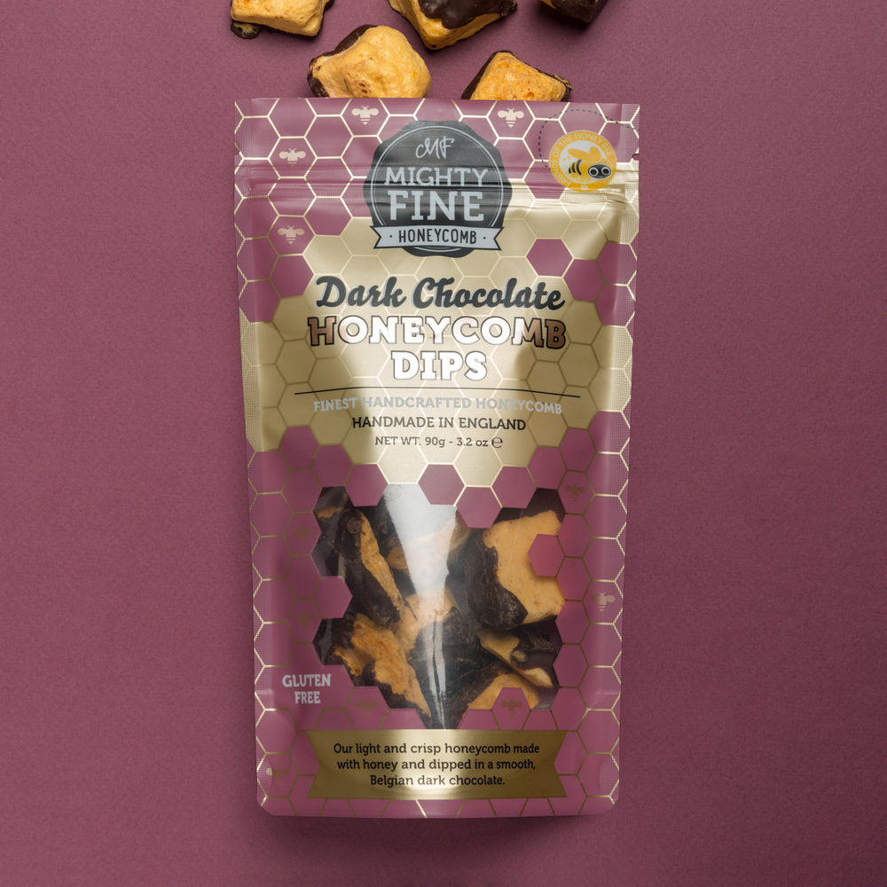 Mighty Fine’s signature light & crisp honeycomb, made with honey, covered in a smooth, Belgian dark chocolate. Handmade using traditional techniques that have been modified to make the very best honeycomb there is. Handmade | Gluten Free | All Natural Ingredients | Vegetarian | Resealable bag. Allergy Information: Products may contain traces of soya, peanuts, nuts & milk.